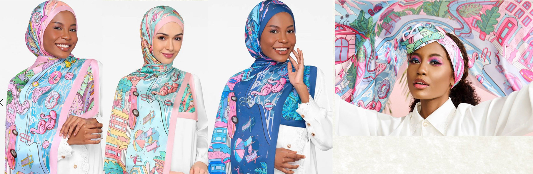 In collaboration with Mattel, the Barbie x dUCk collection, featuring a vibrant tribute to the iconic Barbie Malibu House. First released in the 1960s, this dreamhouse has gone through 10 fabulous makeovers — and now, it lives on through these illustrated scarves. Set against the sparkling sea and golden pink sun, the scarf features a dreamy coastal scene complete with a pool slide, cheeky pink flamingo statues, beach umbrellas, and floaties shaped like donuts and pizza slices. Every detail is a nod to the carefree spirit of Malibu and the timeless charm of Barbie.