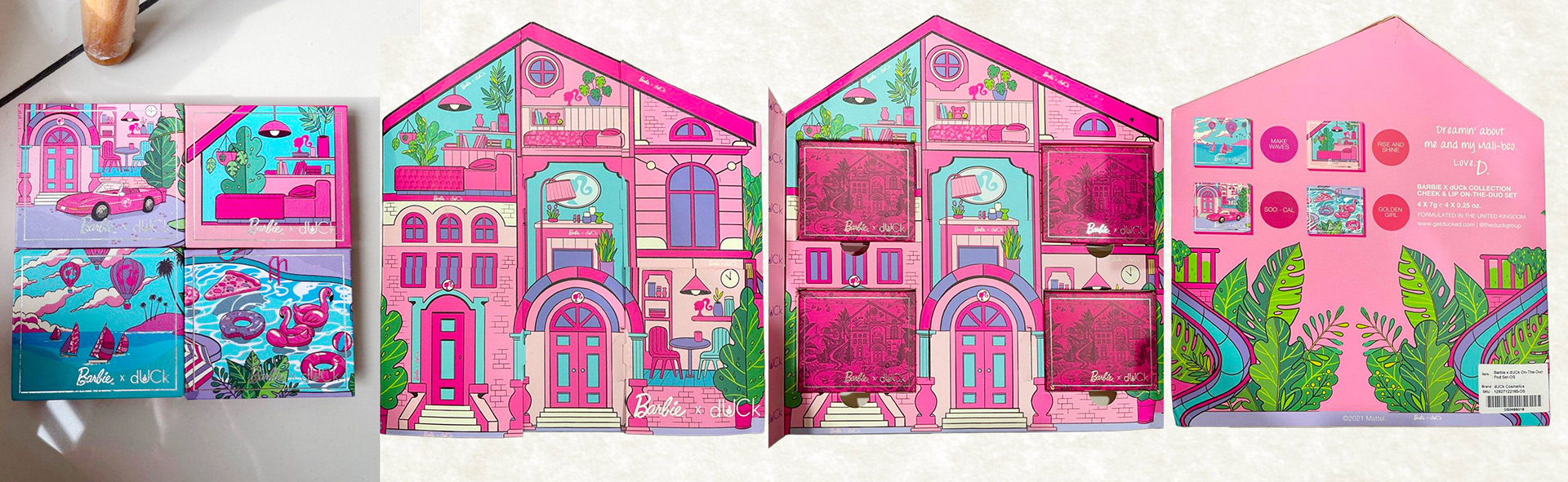 Barbie X dUCk Cosmetics packaging shaped like a Barbie Dreamhouse.
