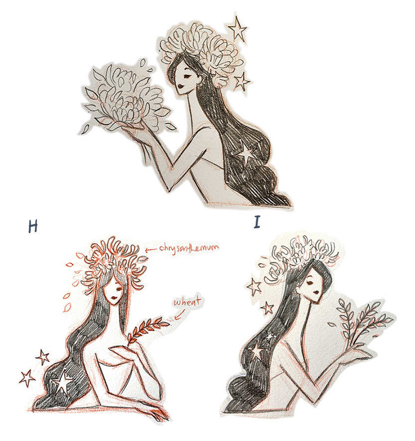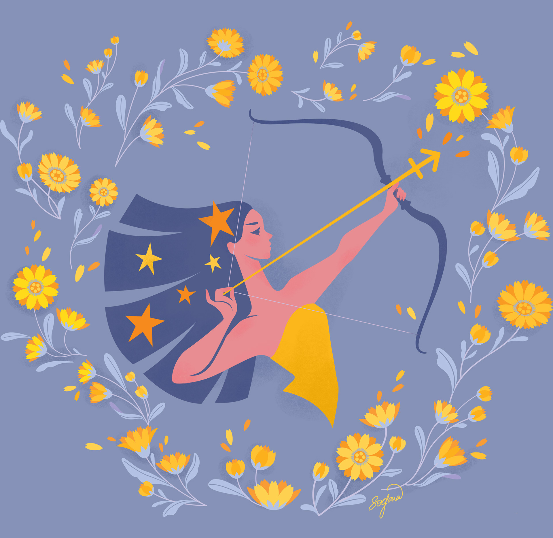Sagittarius – Embodying freedom and fierce determination, Sagittarius stands with confidence — her pose reflecting both strength and poise. She is paired with calendula, a flower that symbolizes vitality, warmth